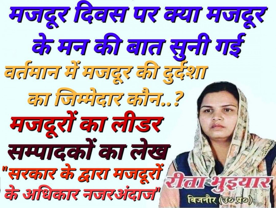 May 01, 2023मजदूर दिवस पर क्या मजदूरों के मन की बात सुनी गई, क्या वास्तव में भारत के मजदूरों को उनके अधिकार दिया जा रहा है, क्या वास्तव में मजदूर का बच्चा अंग्रेजी स्कूल, अन्य मैनेजमेंट के स्कूल में बराबर की भागीदारी मिल रही है, क्या मीडिया वस्ताव में मजदूर की स