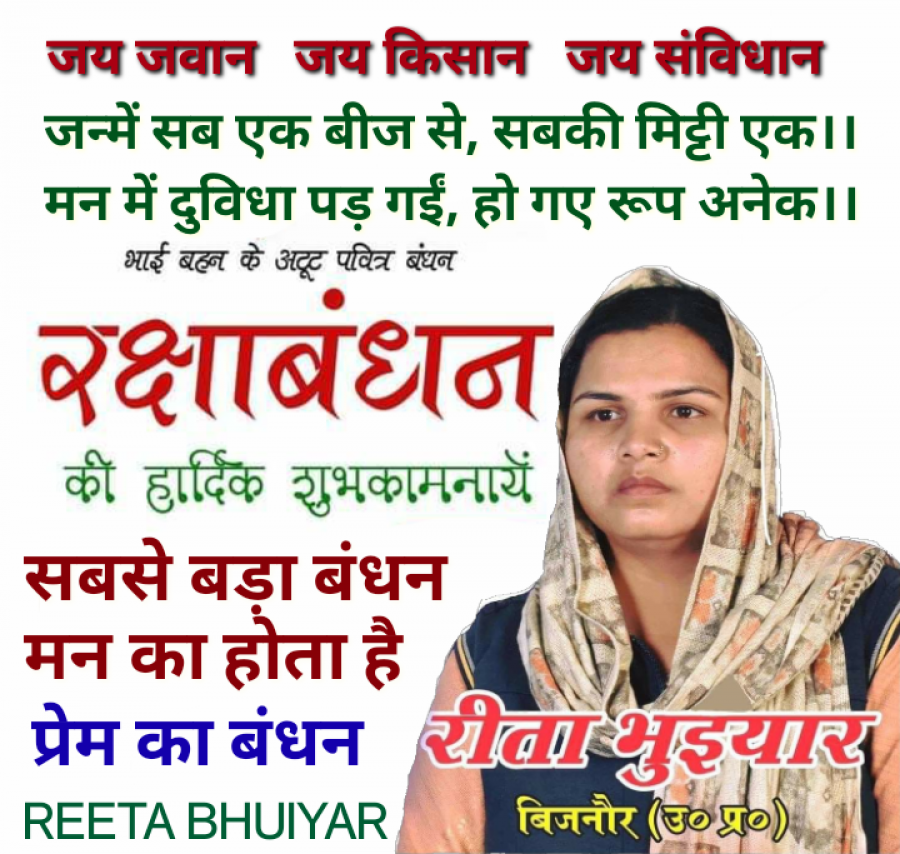 Aug 22, 2021“जन्में सब एक बीज से, सबकी मिट्टी एक“ “मन में दुविधा पड़ गई, हो गये रूप अनेक“✍️ “सबसे बड़ा बंधन मन का होता है, प्यार के बंधन के अनेकों नाम हो सकते है“✍️ “आप सभी को रक्षाबंधन की हार्दिक बधाई“✍️