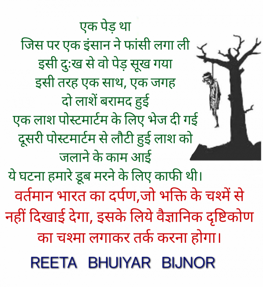 Jun 02, 2021एक पेड़ था जिस पर एक इंसान ने फांसी लगा ली इसी दुःख से वो पेड़ सूख गया इसी तरह एक साथ, एक जगह दो लाशें बरामद हुई एक लाश पोस्टमार्टम के लिए भेज दी गई दूसरी पोस्टमार्टम से लौटी हुई लाश को जलाने के काम आई ये घटना हमारे डूब मरने के लिए काफी थी।
