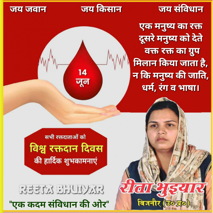 Jun 14, 2021सभी देश वासियों को विश्व रक्तदान दिवस की हार्दिक बधाई, "एक मनुष्य का रक्त दूसरे मनुष्य को देते वक्त रक्त का ग्रुप मिलान किया जाता है, न कि मनुष्य की जाति, धर्म, रंग व भाषा" इस लिये जाति धर्म रंग भाषा अमीर गरीब का भेद छोड़कर मानव बनने व बनाने का विचार