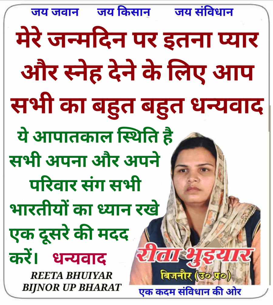 May 17, 2021मेरे जन्म दिन पर इतना प्यार और स्नेह देने के लिए आप सभी का बहुत बहुत धन्यवाद, ये आपातकाल स्थिति है सभी अपना और अपने परिवार संग सभी भारतीयों का ध्यान रखे।एक दूसरे की मदद करें। धन्यवाद
