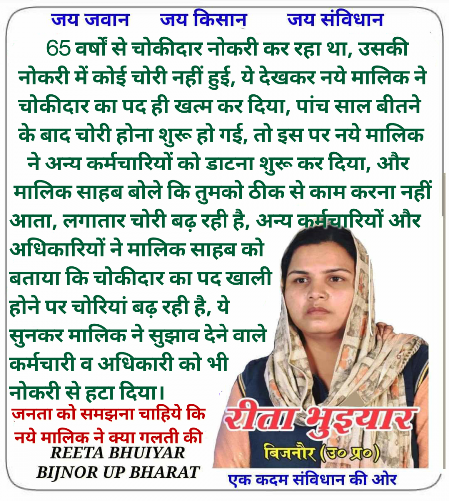 May 20, 202165 वर्षों से चोकीदार नोकरी कर रहा था, उसकी नोकरी में कोई चोरी नहीं हुई, ये देखकर नये मालिक ने चोकीदार का पद ही खत्म कर दिया, पांच साल बीतने के बाद चोरी होना शुरू हो गई, तो इस पर नये मालिक ने अन्य कर्मचारियों को डाटना शुरू कर दिया, और मालिक साहब बोले