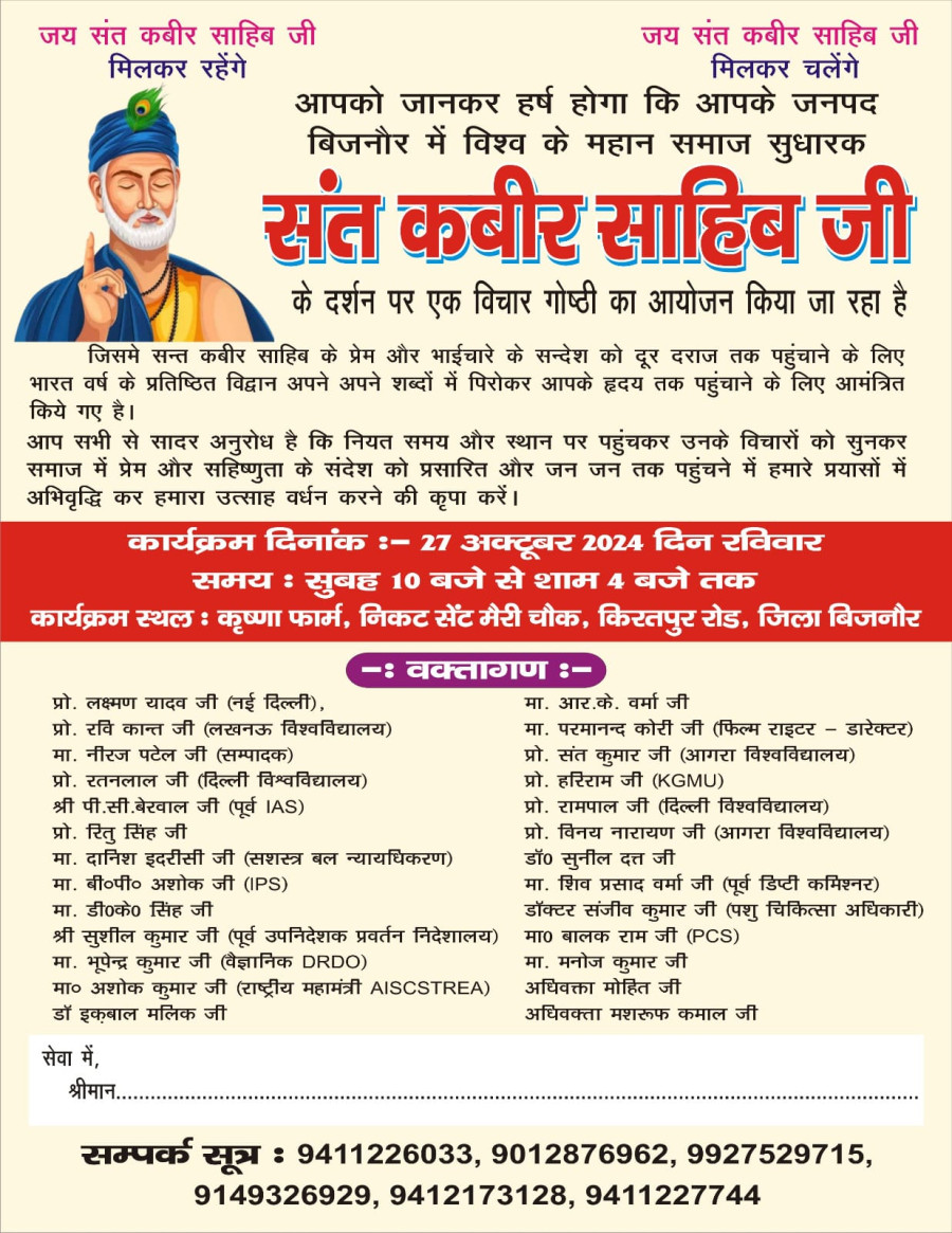 ★सन्त कबीर साहेब विचार गोष्ठी कार्यक्रम सूचना★ *श्रीमान जी* आपसे प्रार्थना है कि आप *दिनाँक 27अक्टूबर2024, दिन रविवार* को 10:00 बजे से 4 बजे तक *स्थान कृष्णा फार्म, निकट सैंटमैरी स्कूल जिला बिजनौर* में सन्त कबीर साहेब विचार गोष्ठी कार्यक्रम में सपर