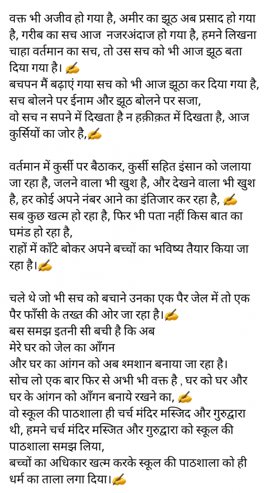 Jul 10, 2021वक्त भी अजीव हो गया है, अमीर का झूठ अब प्रसाद हो गया है, गरीब का सच आज नजरअंदाज हो गया है, हमने लिखना चाहा वर्तमान का सच, तो उस सच को भी आज झूठ बता दिया गया है। ✍️ बचपन मैं बढ़ाएं गया सच को भी आज झूठा कर दिया गया है, सच बोलने पर ईनाम और झूठ बोलने पर
