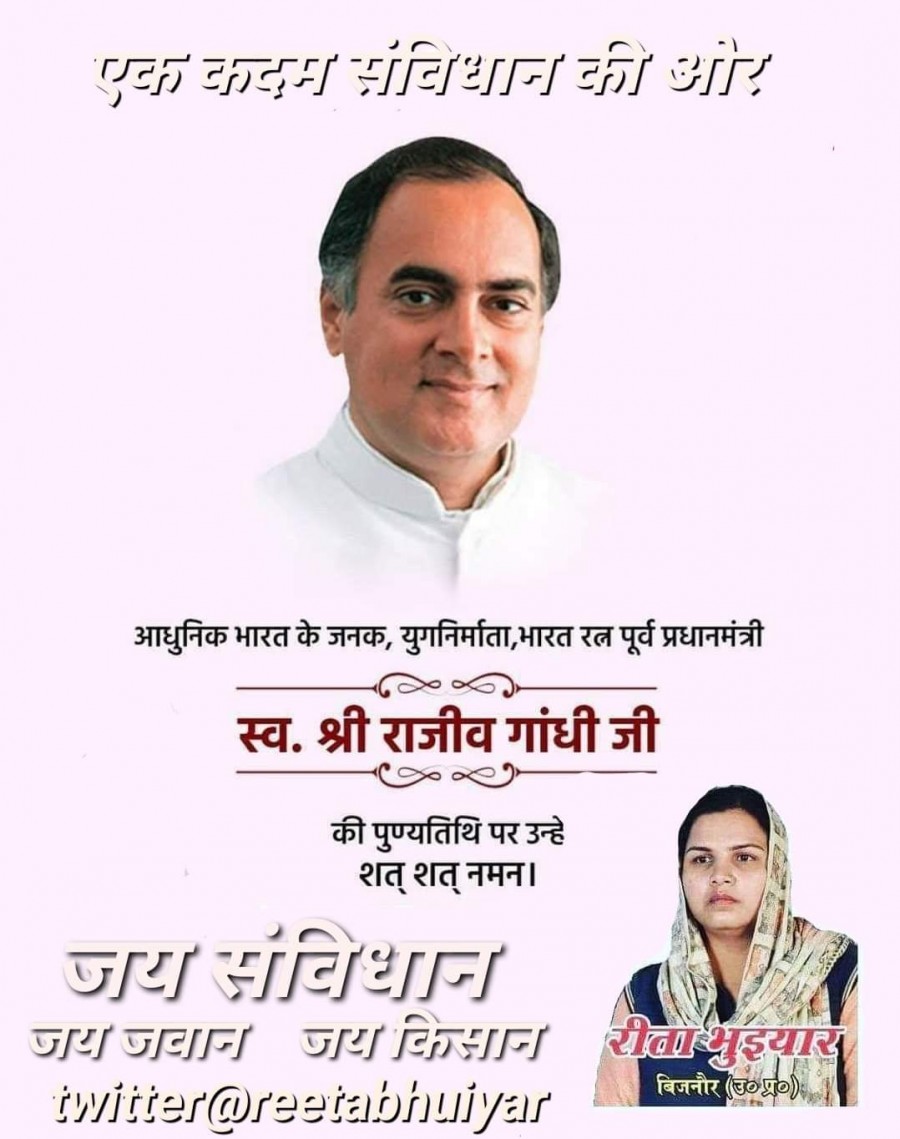 स्व श्री राजीव गांधी जी की पुण्यतिथि पर कोटि कोटि नमन। जय जवान जय किसान जय संविधान