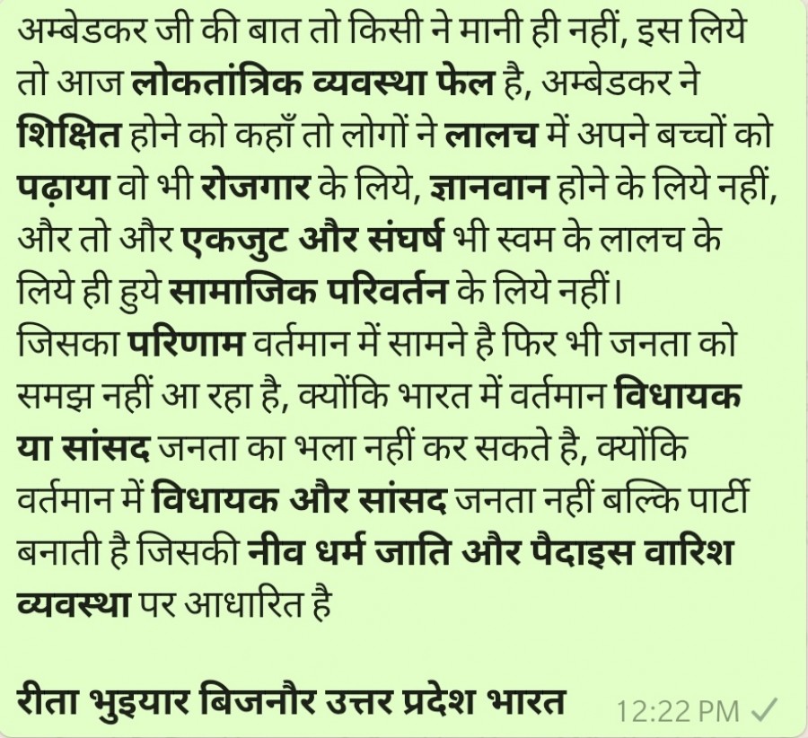Sep 09, 2020अम्बेडकर जी की बात तो किसी ने मानी ही नहीं, इस लिये तो आज *लोकतांत्रिक व्यवस्था फेल* है, अम्बेडकर ने *शिक्षित* होने को कहाँ तो लोगों ने *लालच* में अपने बच्चों को *पढ़ाया* वो भी *रोजगार* के लिये, *ज्ञानवान* होने के लिये नहीं, और तो और *एकजुट और संघर्ष*