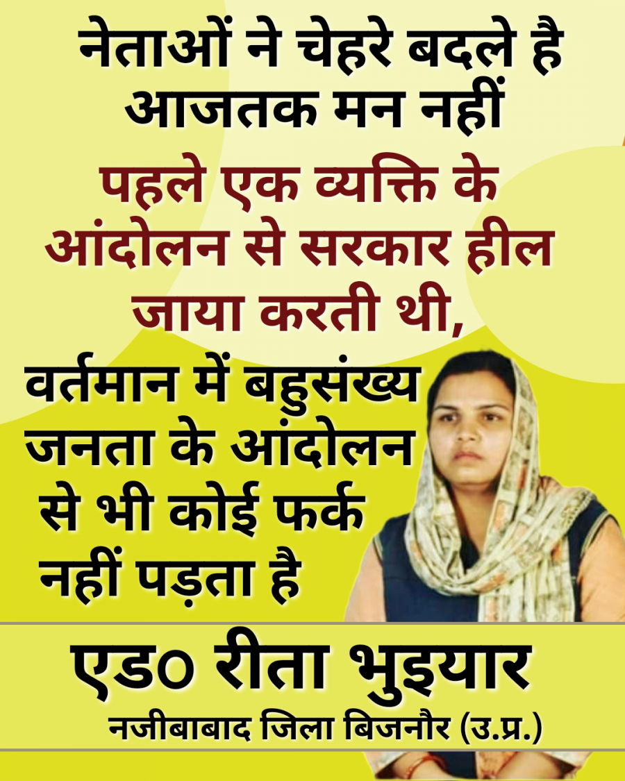 Jul 07, 2023*आजतक नेताओं ने चेहरे बदले है* *मन नहीं* *पहले एक व्यक्ति के आंदोलन से सरकार हील जाया करती थी* *वर्तमान में बहुसंख्यक जनता के आंदोलन से भी सरकार पर कोई फर्क नहीं पड़ता है* *सामाजिक चिंतक* *एडo रीता भुइयार* *नजीबा