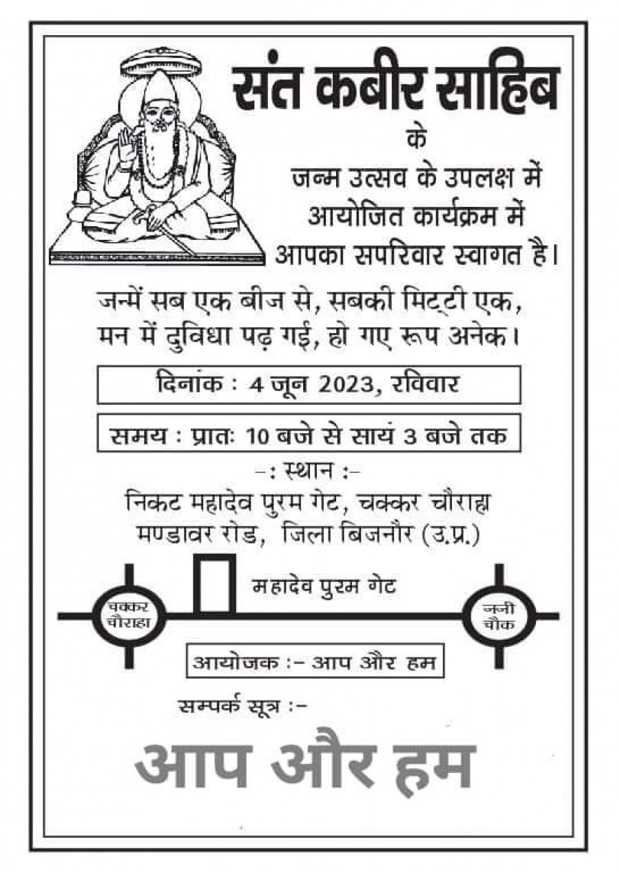 कबीर जयंती 04जून 2023 को 10 बजे से 03 बजे तक, महादेव पुरम, मंडावर रोड, जिला बिजनौर उप्र में मनाई जा