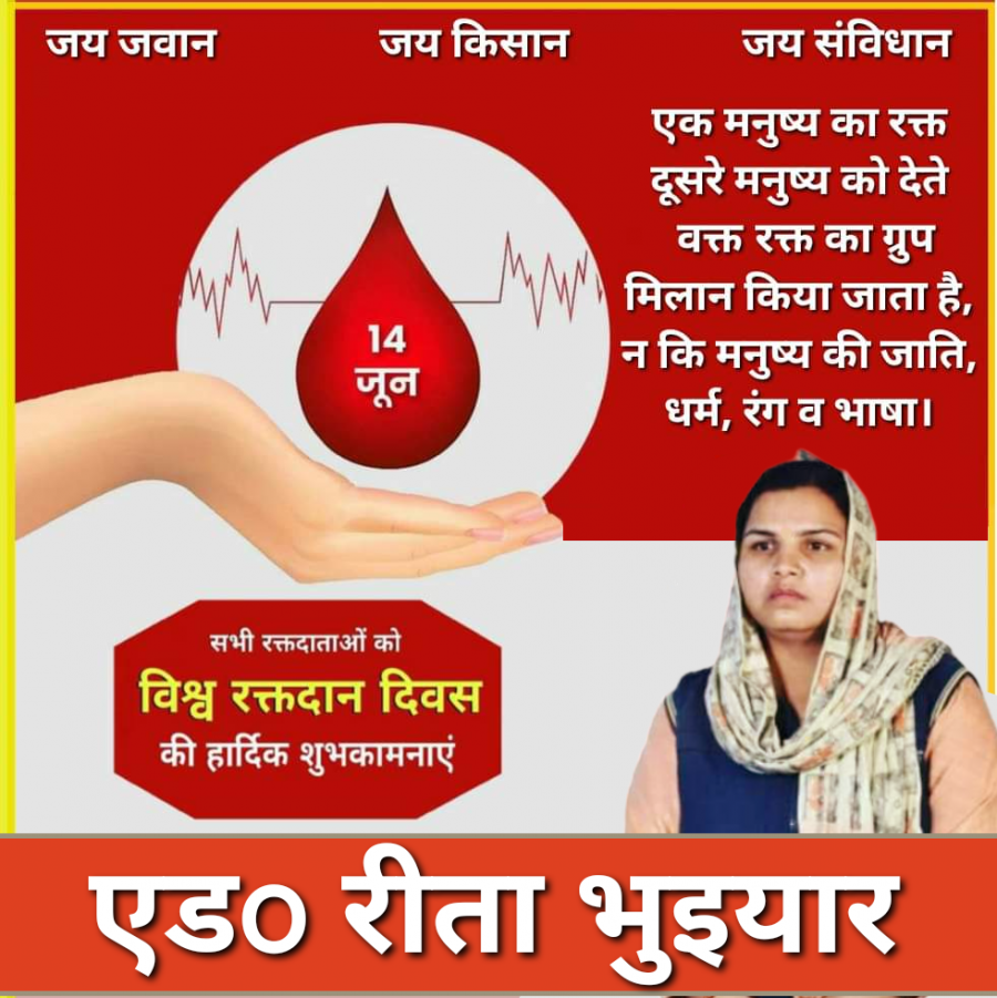 Jun 14, 2023सभी देश वासियों को विश्व रक्तदान दिवस की हार्दिक बधाई, "एक मनुष्य का रक्त दूसरे मनुष्य को देते वक्त रक्त का ग्रुप मिलान किया जाता है, न कि मनुष्य की जाति, धर्म, रंग व भाषा" इस लिये जाति धर्म रंग भाषा अमीर गरीब का भेद छोड़कर मानव बनने व बनाने का विचार