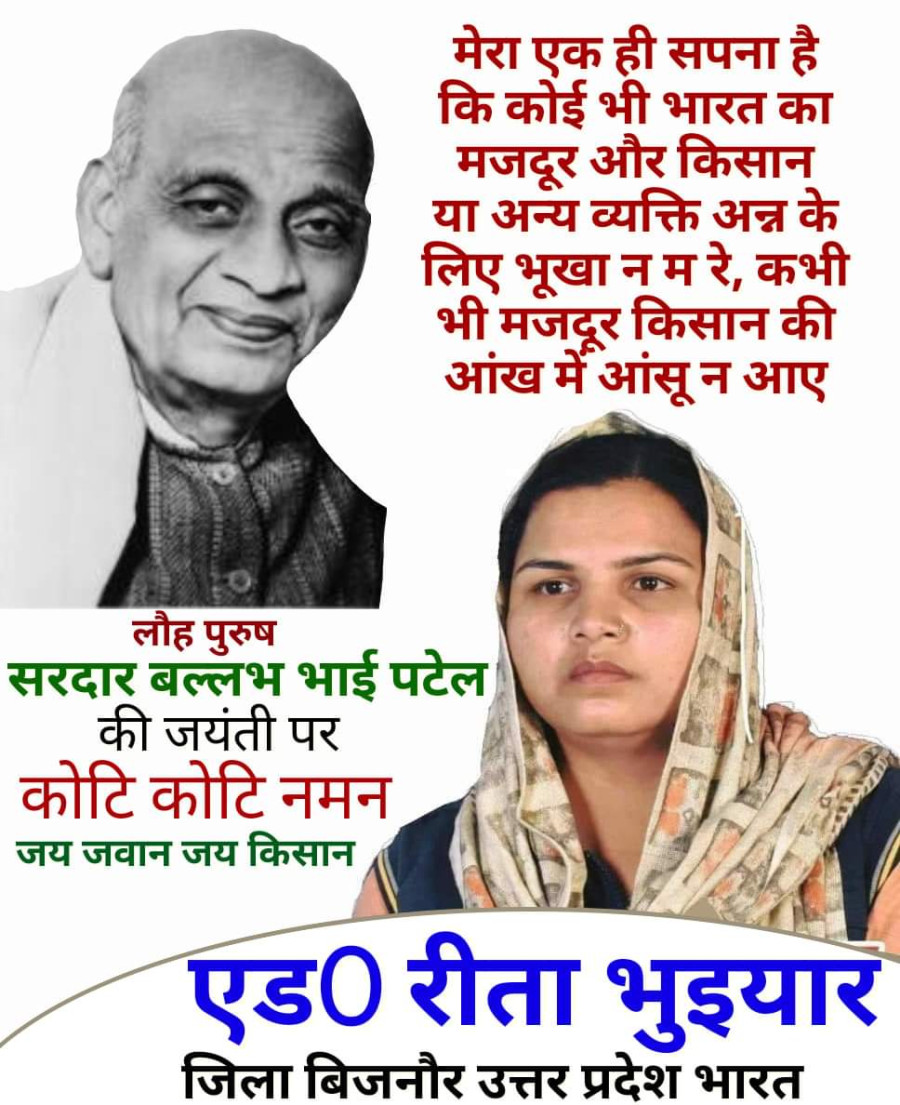 Oct 31, 2023लोह पुरुष के नाम से विख्यात सरदार बल्लभ भाई पटेल की जयंती पर कोटि कोटि नमन✍️ मेरा एक ही सपना है, कोई भी भारत का मजदूर किसान व अन्य व्यक्ति भूख से न मारे, और मजदूर किसान की आंख में आंसू न आए✍️ आज हमें ऊंच नीच अमीर गरीब जाति पंथ के भेदभाव को सम्मात कर