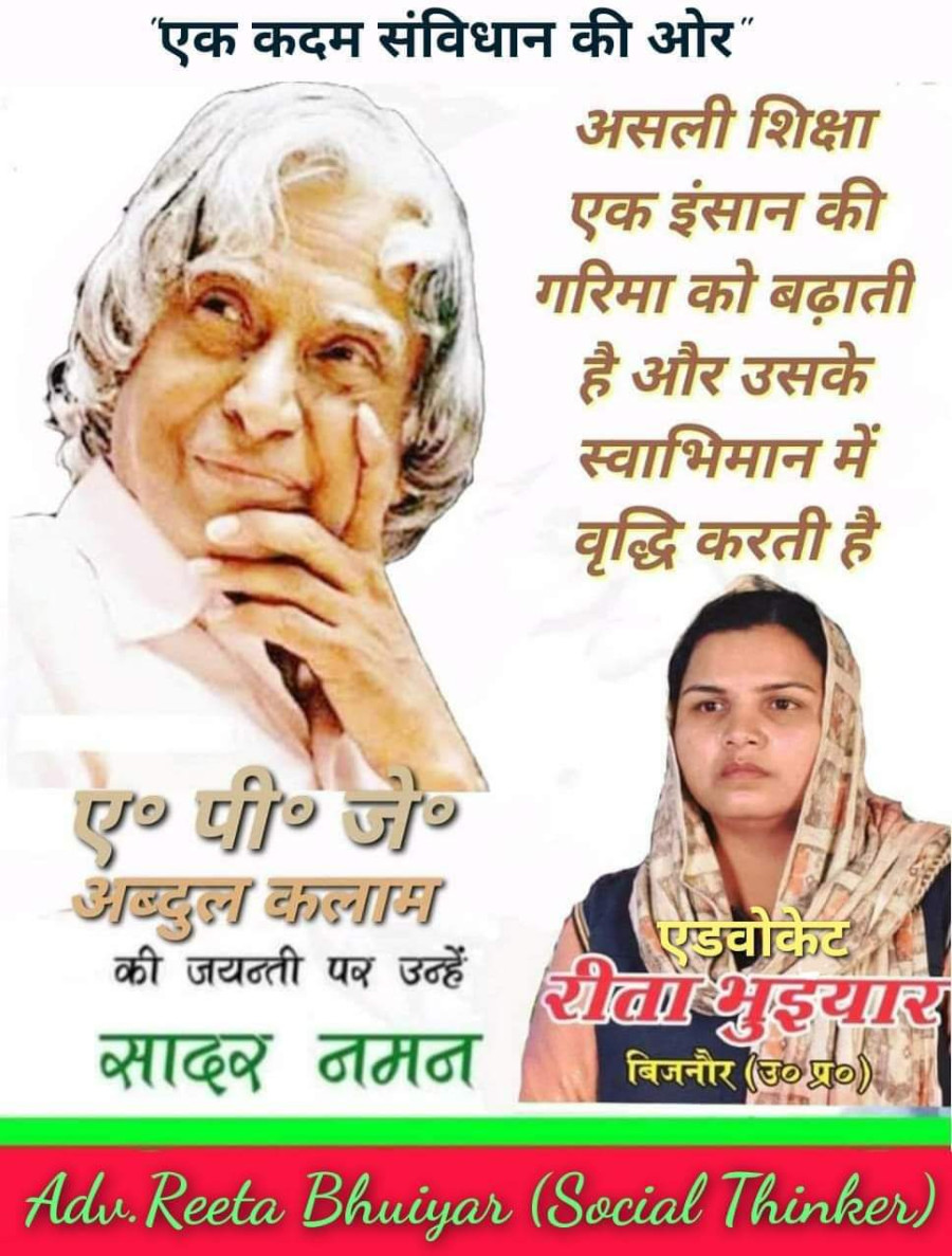 Oct 15, 2023"कलाम साहब ने कभी भी भारतीय जनता की पहचान धर्मजाति, भाषा और रंग के आधार पर नहीं की"✍️ "देश के पूर्व राष्ट्रपति, महान वैज्ञानिक कलाम साहब की पूरी ज़िंदगी, अपने आप में एक सीख है हर पीढ़ी के लिए, डॉ. कलाम की सफलता उनकी गहन सोच का परिणाम थी, उन्होंने अप