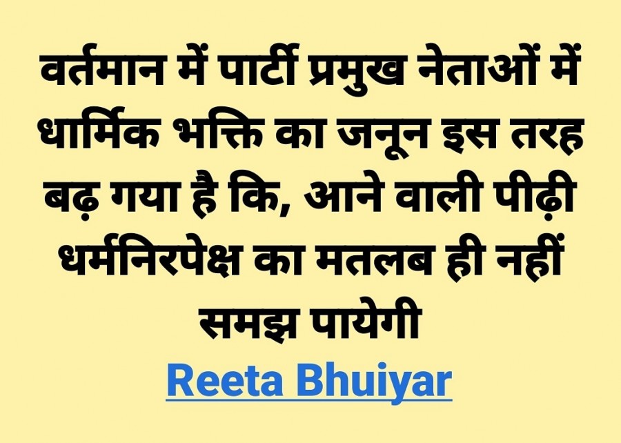 Mar 02, 2021वर्तमान में पार्टी प्रमुख नेताओं में धार्मिक भक्ति का जनून इस तरह बढ़ गया है कि, आने वाली पीढ़ी धर्मनिरपेक्ष का मतलब ही नहीं समझ पायेगी Reeta Bhuiyar