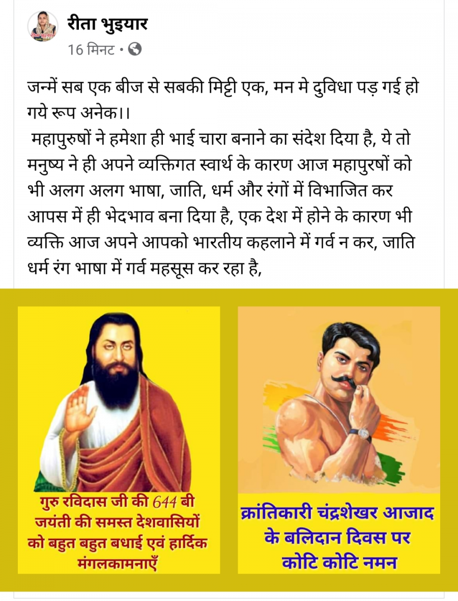 Feb 27, 2021जन्में सब एक बीज से, सबकी मिट्टी एक। मन मे दुविधा पड़ गई, हो गये रूप अनेक।। महापुरुषों ने हमेशा ही भाई चारा बनाने का संदेश दिया है, ये तो मनुष्य ने ही अपने व्यक्तिगत स्वार्थ के कारण आज महापुरषों को भी अलग अलग भाषा, जाति, धर्म और रंगों में विभाजित कर