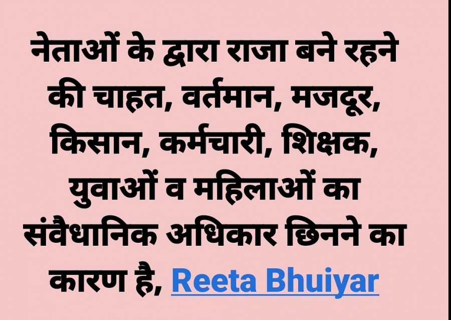 Mar 02, 2021नेताओं के द्वारा राजा बने रहने की चाहत, वर्तमान, मजदूर, किसान, कर्मचारी, शिक्षक, युवाओं व महिलाओं का संवैधानिक अधिकार छिनने का कारण है, Reeta Bhuiyar